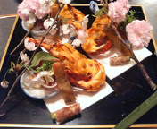 一年ぶりに2泊3日京都に行ってきました。仕事が終わらないまま(汗)(終わるはずだったのおお!)お宿はいつも泊まっている京都御苑の近所にあるブライトンホテル。今回私はひたすら食べていた。友人と別行動でホテルの近所の虎屋菓寮でお汁粉とねりきりとお抹茶を飲み(このティールームは天上が高くガラス張りで外の緑が気持ちよくすごく落ち着けます)味噌屋さんで白味噌を買い、夜は恒例の鉢盛り懐石。メニューのその名も「宵さくら」お料理に桜の枝がディスプレイされていました。竹の子と蕗の季節です。ああ日本人に生まれてよかったとしみじみ。写真はロブスターのウニ焼き。3人分が大皿に盛られています。翌日は地下鉄に乗って三条京阪駅の近所の内藤商店に棕櫚のたわしを買いに行く。絵を描くときに使えそうな平な刷毛も一緒に。小さな呉服屋にディスプレイされている着物の帯を眺めつつ歩いて祇園へ。鍵善良房喫茶室でくずきりを黒蜜で食す。うま〜〜。京飴屋で飴玉を購入。小物やさんをひやかしつつ八坂神社を見ると鳥居(でしたか?入り口にあるのは?)修復中でおおいがかけられ、行って見る気力がそげましたのでタクシーに乗って京都駅の伊勢丹へ。デパ地下へ。お弁当のチェックをしにいったのですけど…お惣菜屋さんが…おお!おいしそう!!関東とはお店が違うので興味深々。まずいことにお昼を食べずに歩いていたのでお腹がきゅうきゅう。困ったなあと思い試食コーナーで端から試食してまわった(恥ずかしい私)もう、買って食べてみたいものばかりなのですが、夕食が食べられなくなったら困る。でも100グラムなら…と竹の子サラダと菜の花おからを購入。山椒ちりめんとスーパーでイチジクのパンと鳥取のジャージーヨーグルトを買いました。二条城に行こうと思っていたのですが。ふと気づくと4時を回っていて…だめじゃないですか。もう閉館時間じゃないですか。しかたないのでホテルに戻ることに。書店で桜の本を買って帰りました。…そして買ってきたお惣菜などを部屋を食しながら友人の帰りを待ちました。夕食は鉄板焼き!